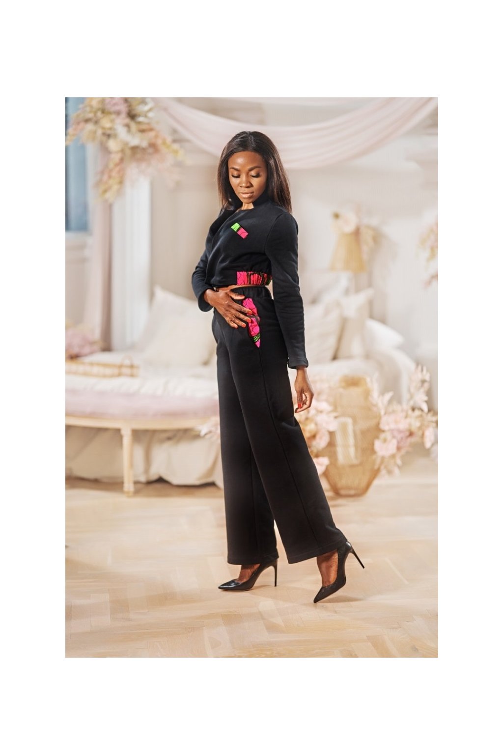 Představujeme vám náš černý sportovně elegantní set z africké látky s brazilským střihem na bocích a vysokým pasem. Mikina s rukávy na zip a černé široké kalhoty přinášejí všestrannost. Vysoký pas dodává eleganci a šmrnc. Vše vyrobeno z 100% bavlny pro dokonalý vzhled a komfort. Set je k dispozici ve velikostech S a M, s možností zakázky na míru. Kromě toho nabízíme volbu individuální barvy dle vašeho výběru a možnost doladit detaily podle vašich přání, abyste měli set přesně podle svého vkusu a rozměrů. Celkový design je propracovaný a vkusný, což dělá z tohoto setu vhodný kousek pro různé formální i neformální příležitosti.